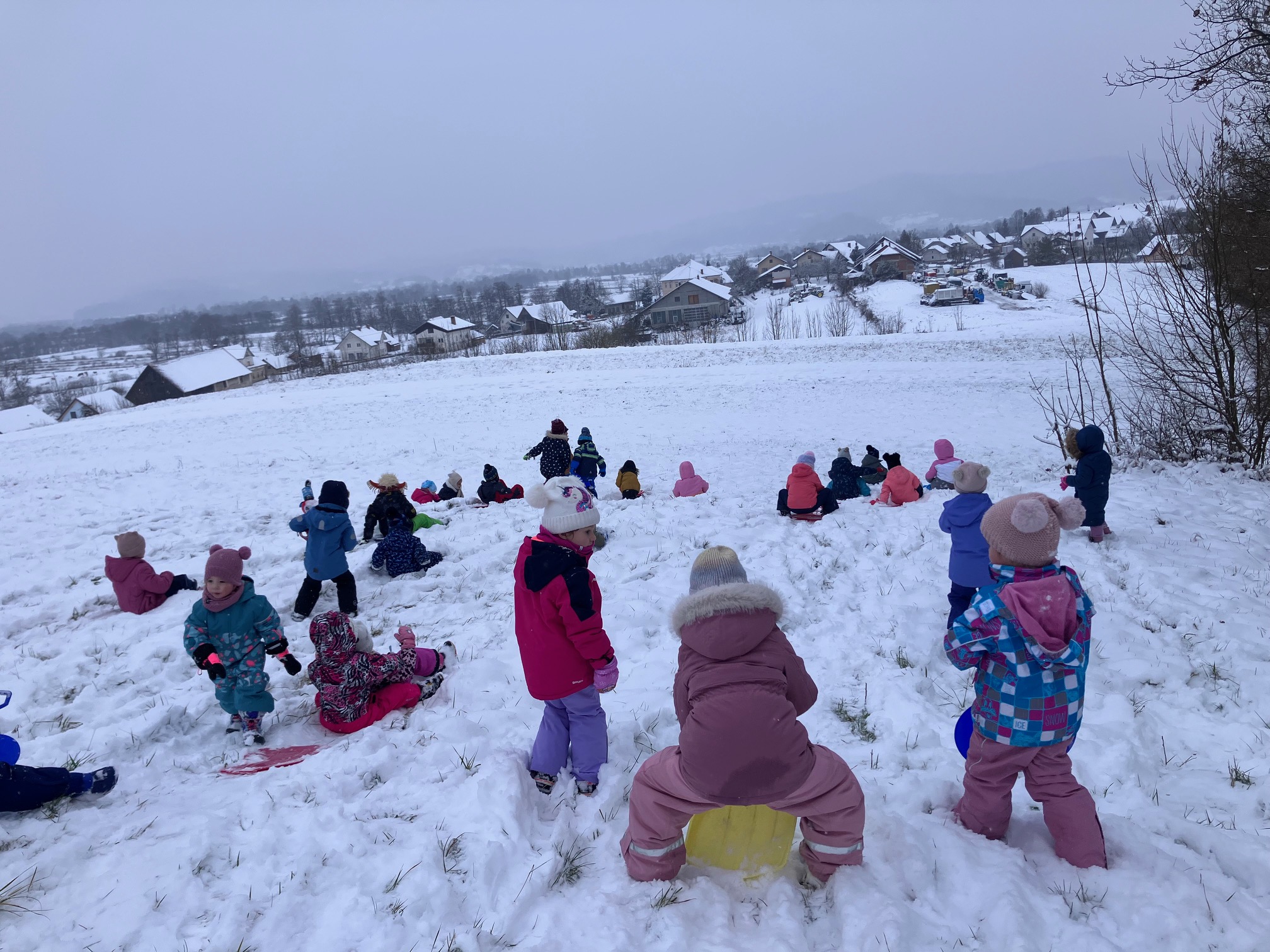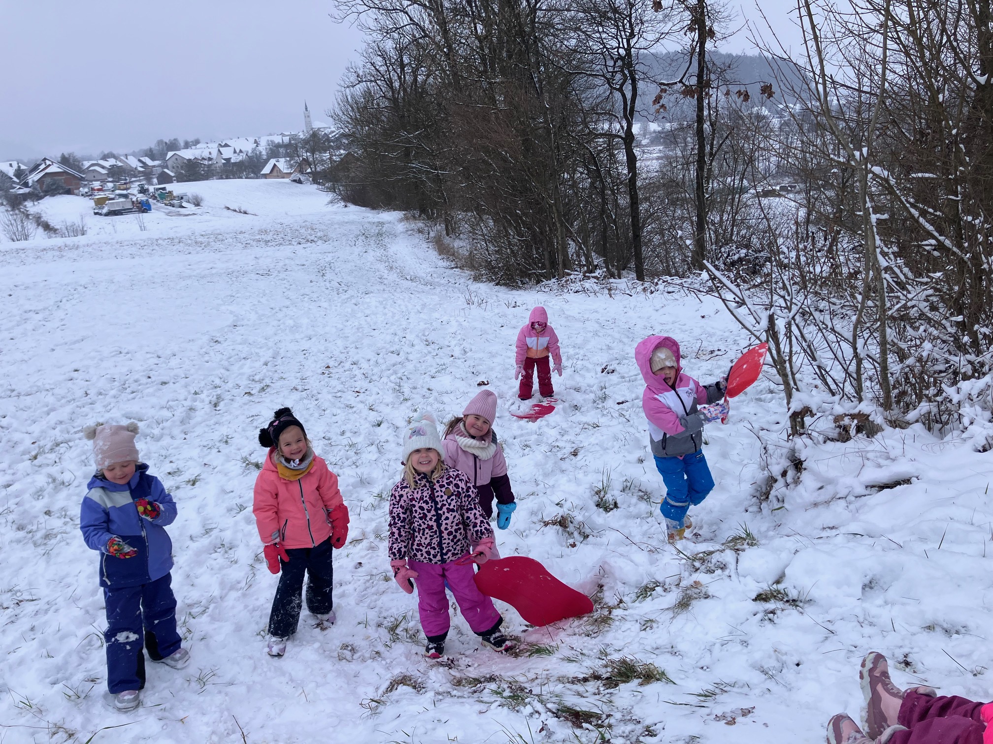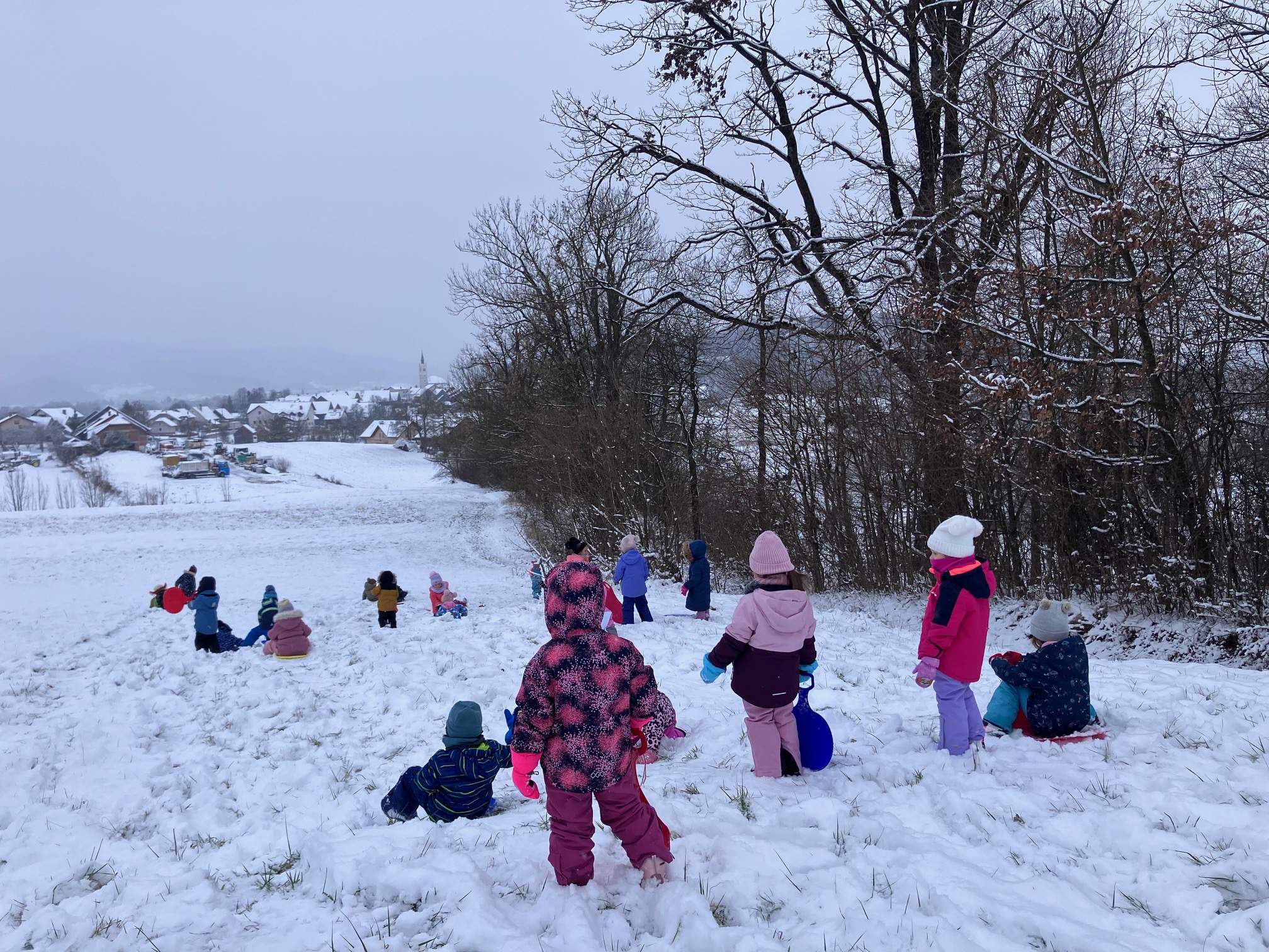 Pot nas je vodila do hriba, kjer se je začel pravi fit izziv. Hoja navkreber je ogrela mišice, lopatanje po snegu pa je hitro poskrbelo za rdeča lička in iskrive nasmehe. En, dva, tri po hribu navzdol in smet gor, lovljenje snežink, ki je izvalo pravo evforijo, in kjer ni manjkalo smeha, navdušenja in glasnega navijanja. Posebno veselje je prineslo tudi kotaljenje po zasneženem hribu – nekateri pogumno, drugi malo bolj previdno, vsi pa z veliko dobre volje.