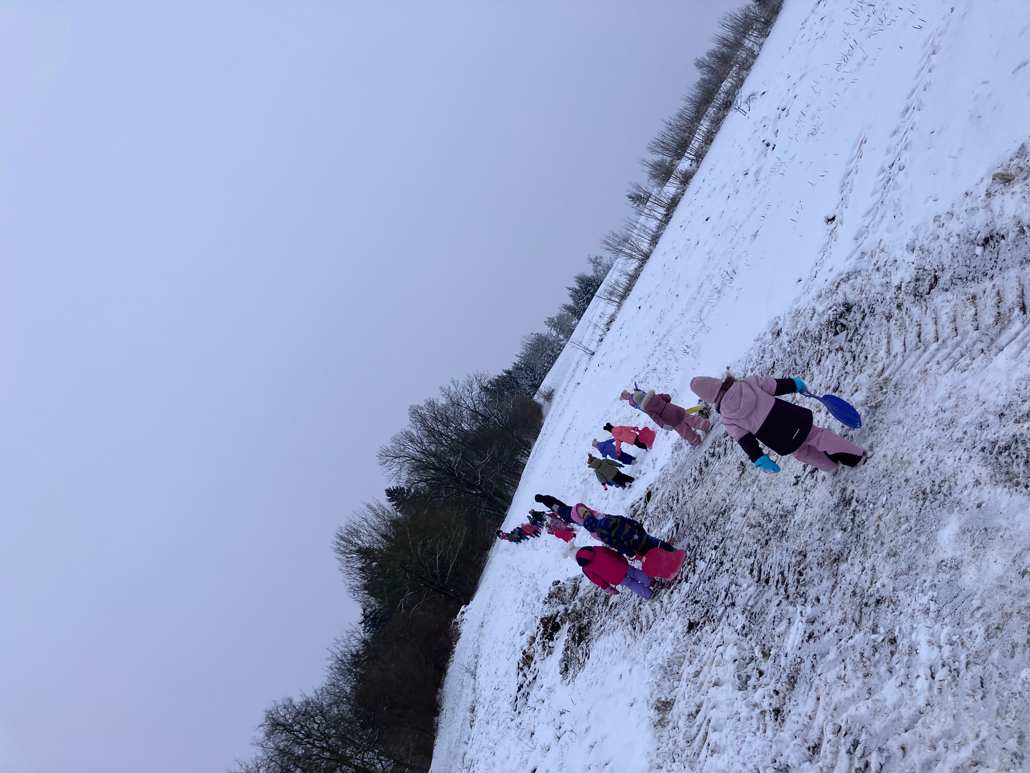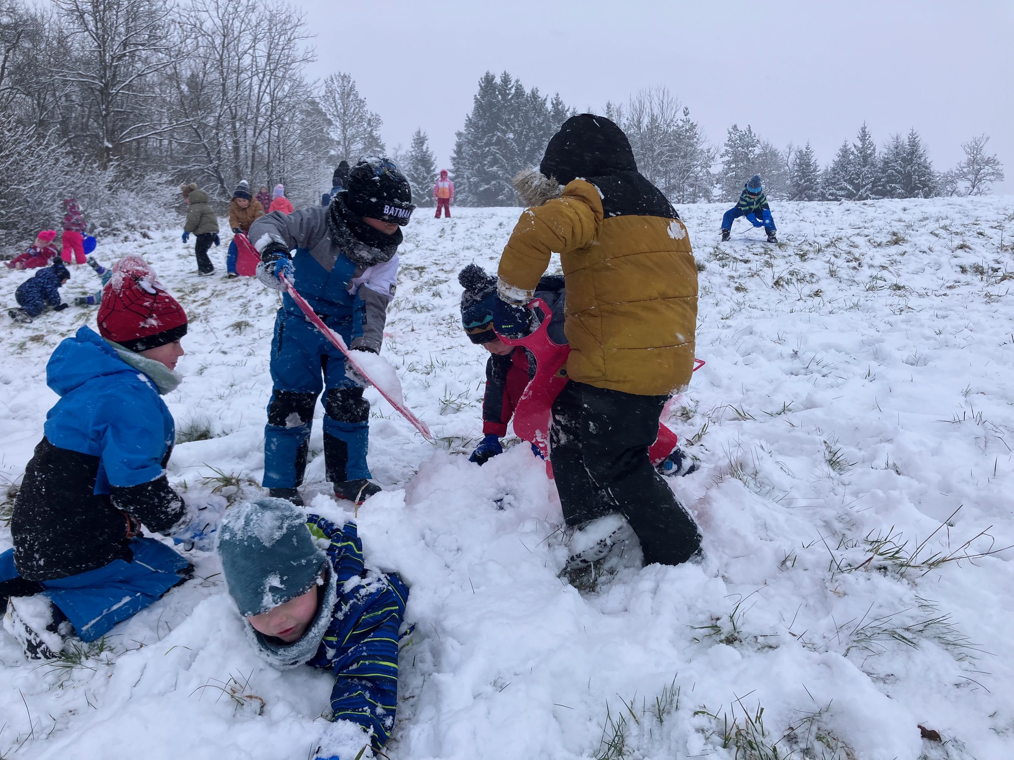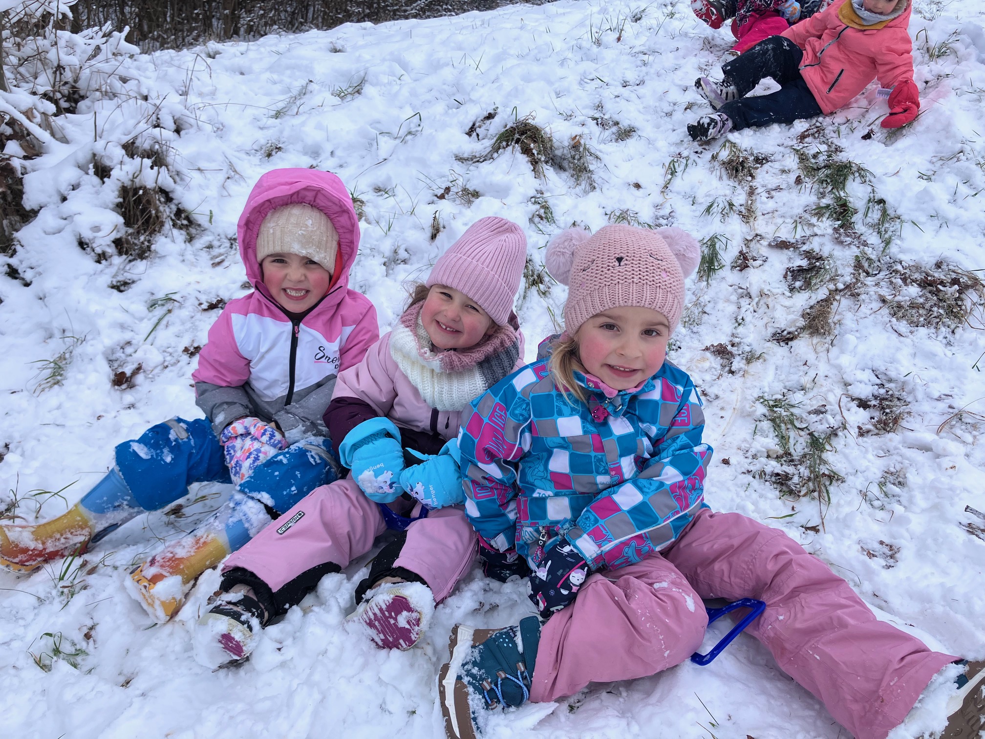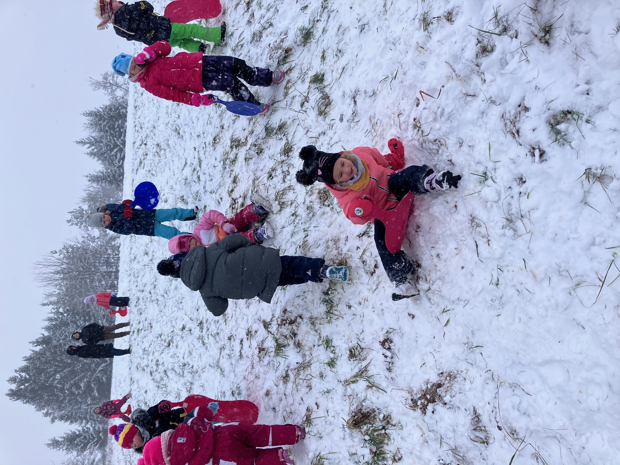 Pot nas je vodila do hriba, kjer se je začel pravi fit izziv. Hoja navkreber je ogrela mišice, lopatanje po snegu pa je hitro poskrbelo za rdeča lička in iskrive nasmehe. En, dva, tri po hribu navzdol in smet gor, lovljenje snežink, ki je izvalo pravo evforijo, in kjer ni manjkalo smeha, navdušenja in glasnega navijanja. Posebno veselje je prineslo tudi kotaljenje po zasneženem hribu – nekateri pogumno, drugi malo bolj previdno, vsi pa z veliko dobre volje.